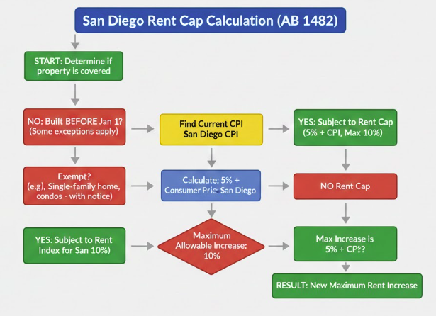- The Rent Cap: AB 1482 generally limits annual rent increases to 5% plus the local CPI, capped at a maximum of 10% total. Local San Diego Property Management ordinances may apply.